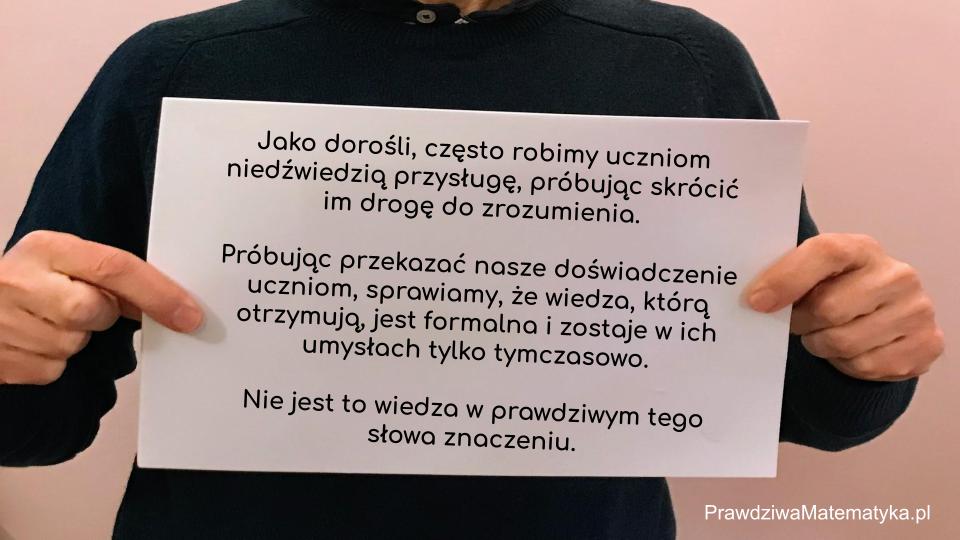 Matematyka szkolna, to matematyka, którą dzieci robią bez zrozumienia, naśladując algorytmy i metody podane przez nauczyciela. Prawdziwa matematyka, to matematyka, którą dzieci przeżywają, eksplorują, rozumieją i tworzą. Czy wolisz żeby…