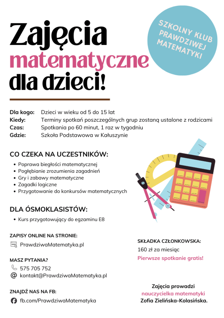 Zapraszam do kontaktu rodziców uczniów ze szkoły w Kałuszynie, zainteresowanych udziałem dzieci w warsztatach matematycznych.