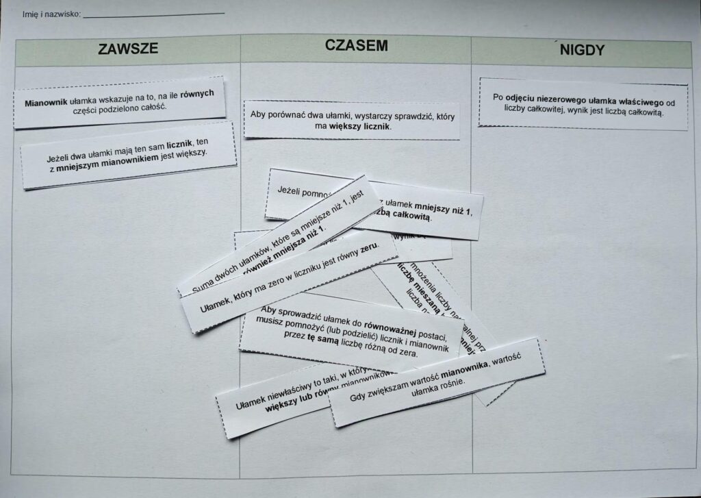 Z tą myślą, a przede wszystkim w odpowiedzi na potrzeby moich uczniów, przygotowałam kartę pracy, który wykracza poza tradycyjną formę ćwiczeń: „Ułamki zwykłe – sortowanie stwierdzeń – ZAWSZE, CZASEM, NIGDY”.
