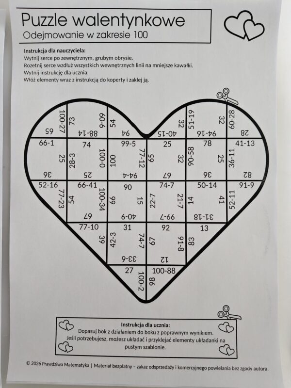 Czy szukasz kreatywnego sposobu na powtórzenie czterech działań na liczbach naturalnych w zakresie 100? Specjalnie z okazji Walentynek przygotowałam dla Ciebie i Twoich uczniów coś wyjątkowego – matematyczne puzzle w kształcie serca!